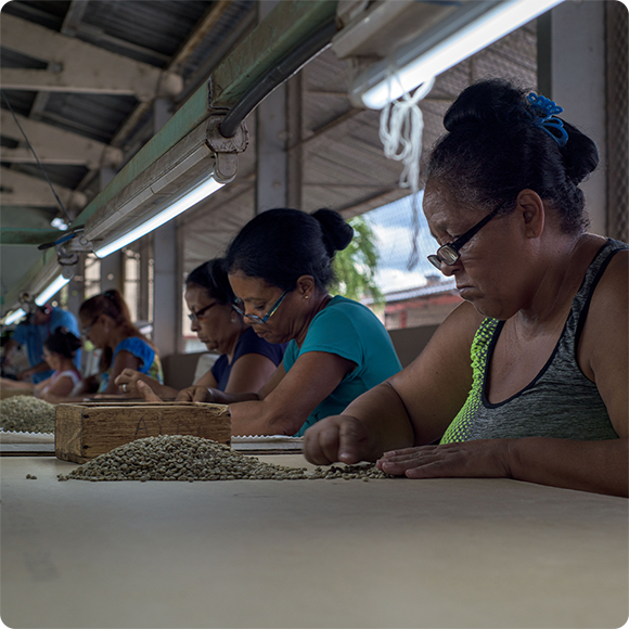 Selecting and sorting different types of coffee can improve their overall value and in-cup quality. This activity is carried out using coffee sieves (to separate bean sizes) and a sorting machine (to remove major defects). Lavazza Foundation has implemented a final manual sorting system, carried out and managed by an all-female team of 95 women. Thanks to this final step, is now possible to sort the coffee by quality and eliminate the defects that could not be mechanically identified.