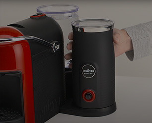 Watch the video The video shows the tutorial for the preparation of milk-based drinks with the Lavazza A Modo Mio Jolie&Milk coffee machine. First, it is necessary to heat and/or froth the milk using the cappuccino maker. Cappuccino (hot and frothed milk): Pour the cold milk into the cappuccino maker, keeping between the MIN and FROTH levels, and place it on the electrical base. Press the multifunction button once. The cappuccino maker will turn off automatically when preparation is complete. The cappuccino is ready. Hot milk: Pour the cold milk between the MIN and LATTE levels, then position the cappuccino maker on its base. Press the multifunction button twice in quick succession. The hot milk is ready (ideal for a latte macchiato). Cold frothed milk: Pour the cold milk between the MIN and FROTH levels, then position the cappuccino maker on the base. Press and hold the multifunction button for at least 3 seconds. The milk will be cold frothed: perfect for a cold espresso macchiato.